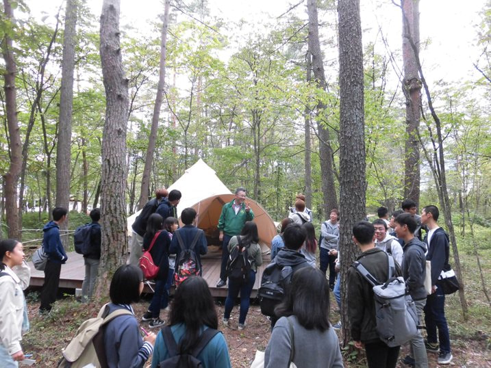 直営の「農かふぇ」でオリジナル弁当をいただき、午後は農場視察。稲作の大きな機械や施設を見学。最後は、本年度オープンの「グランピング」のお話を聞き、農業体験のできるキャンプ場を一周。「宿泊単価はいくらか。」の問いかけに、学生は、下は5,000円/泊から上は150,000円/泊までの答え。